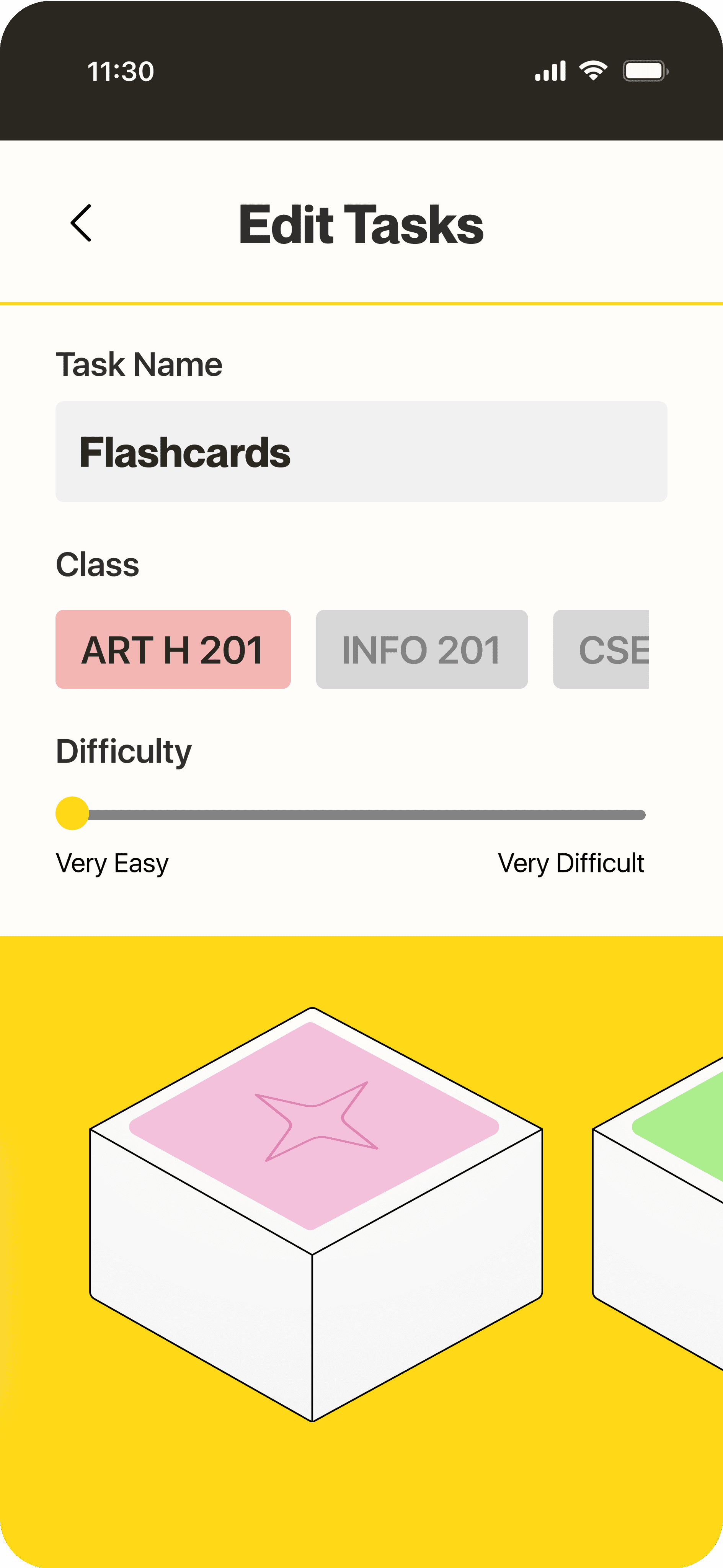 We chose to keep the yellow Brain Power slider and grey text box when users assigned and created tasks, developing animations for these features. We received internal feedback from the rest of the team that the animation was too slow, particularly for the blur effect to wear off. Additionally, there were inconsistencies in the colors and the names of the homework assignments.