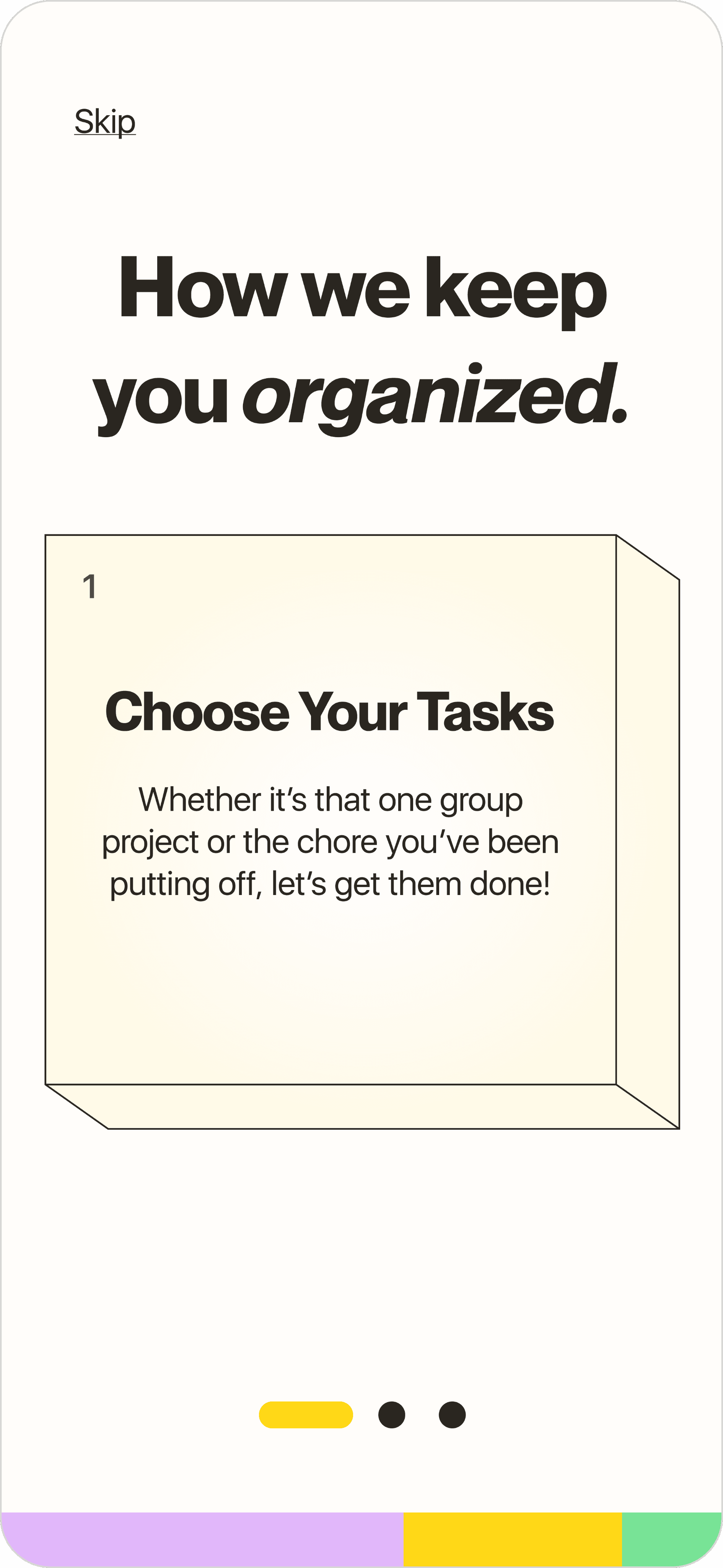 Furthering our development of the onboarding process, we developed a flow for a trial run in this iteration. This animation emulated the movement of the blocks that we were going for, but was too harsh and moved too fast.