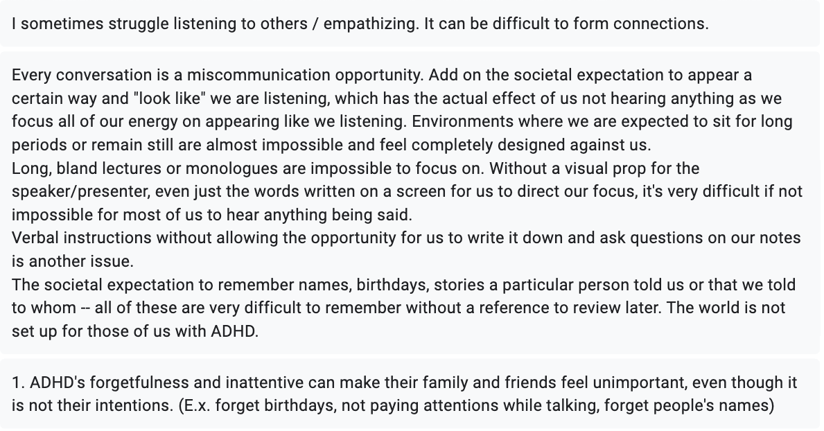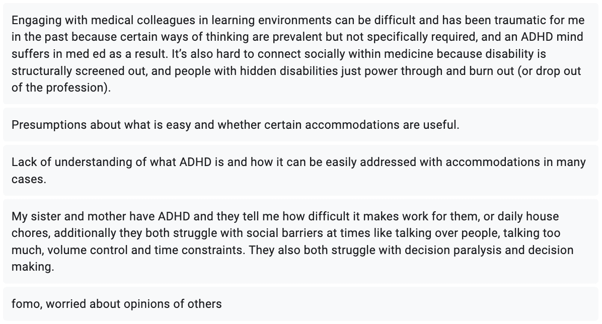 Survey respondents detailing the social barriers they face as a result of ADHD.