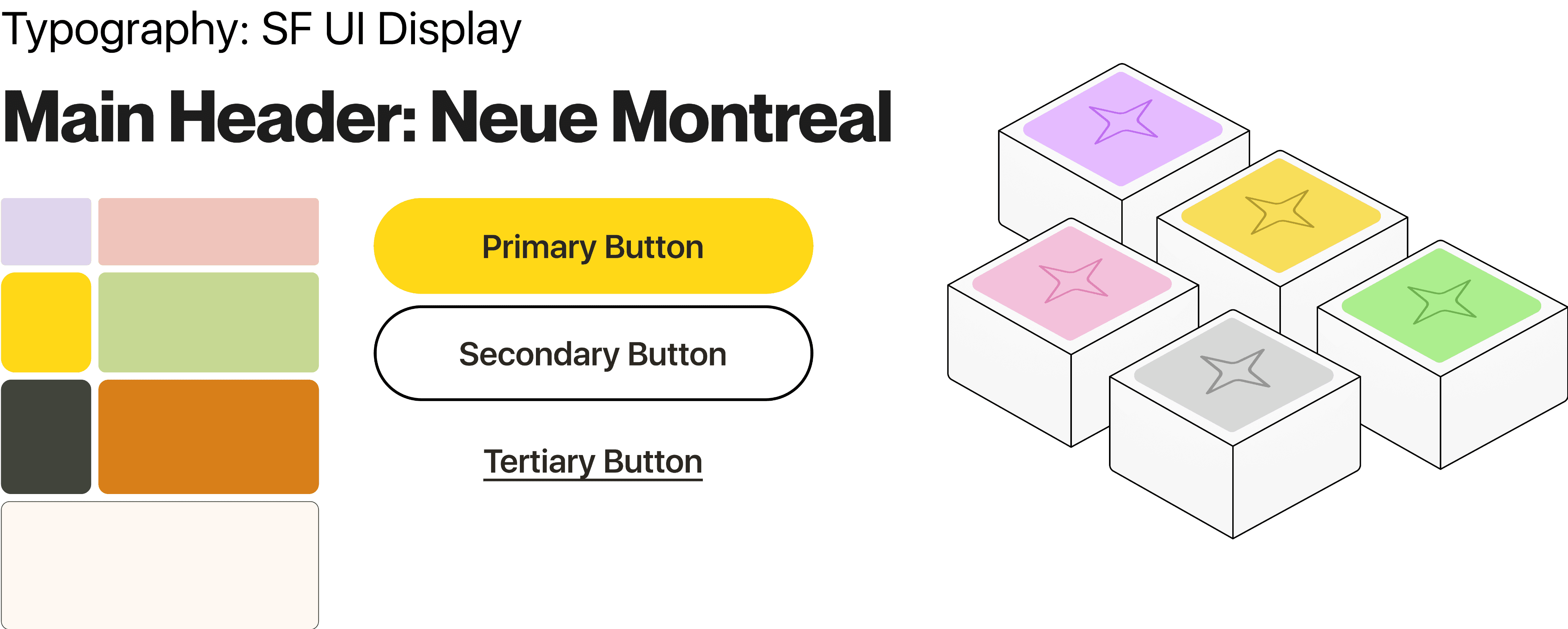 Using the themes reflected in the moodboard, we created a style guide of colors, texts, buttons, and blocks that would be used in our UI.