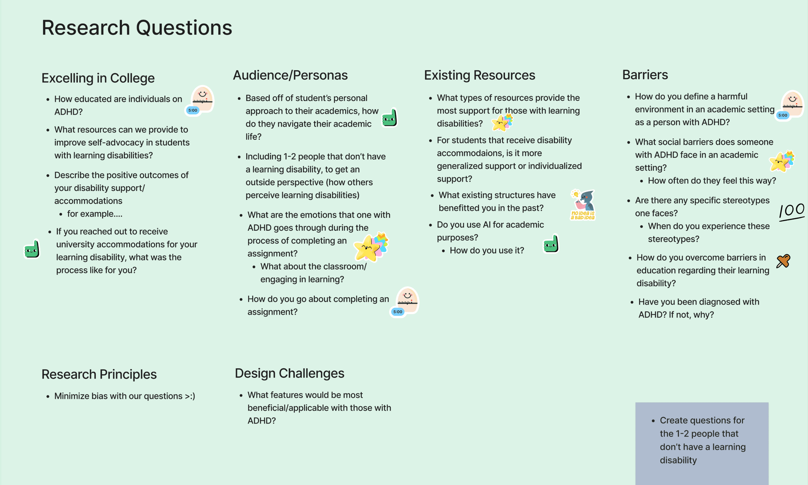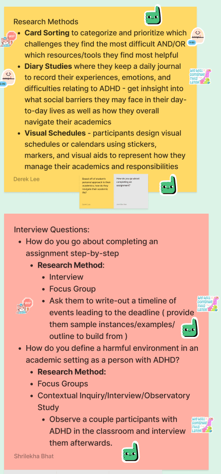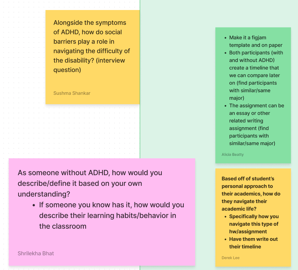 We received over 20 responses and were able to use the responses to identify common struggles felt by students with ADHD, and then develop an interview protocol to dive deeper into these sentiments.